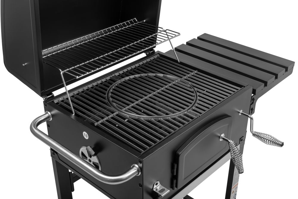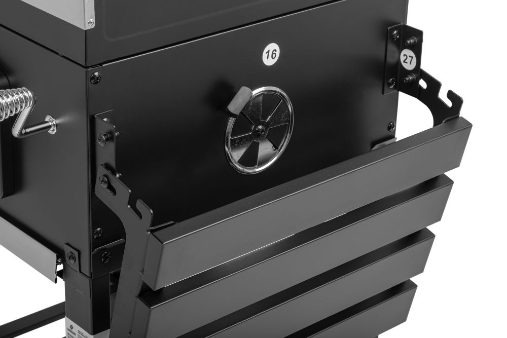 - sterowanie temperaturą grillowania za pomocą płynnej regulacji wysokości paleniska;