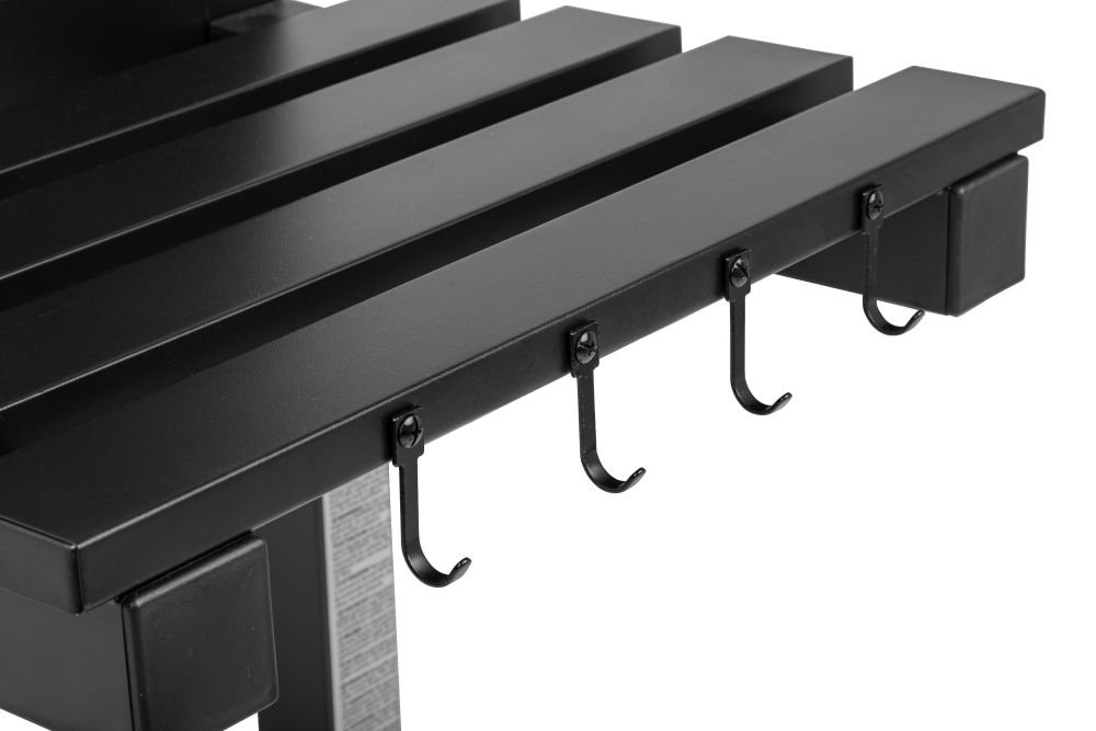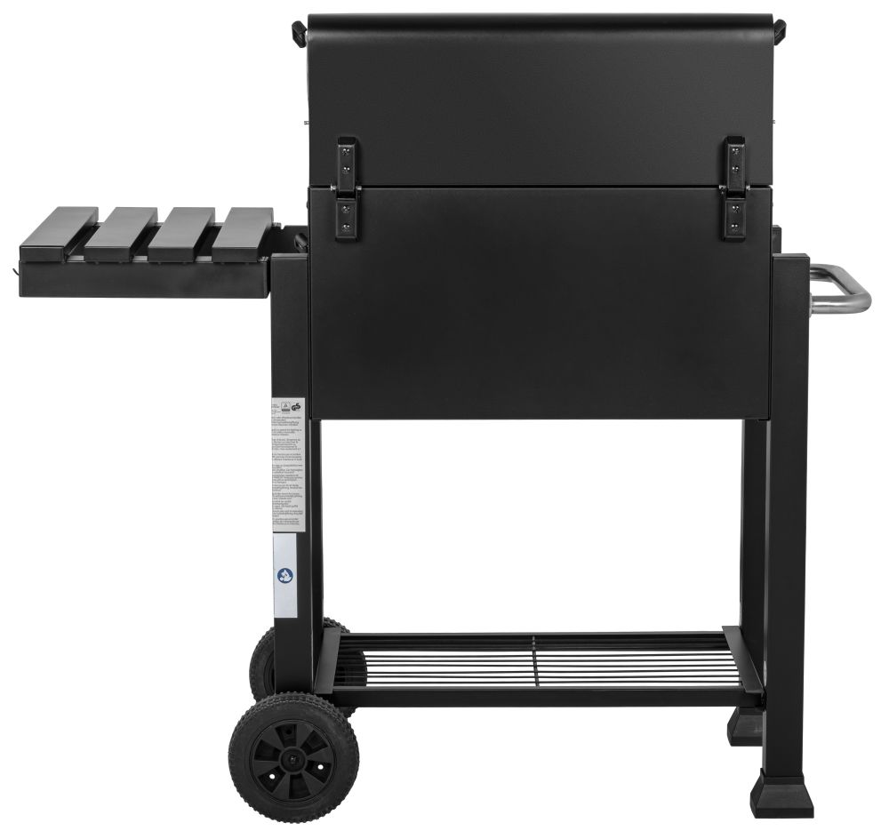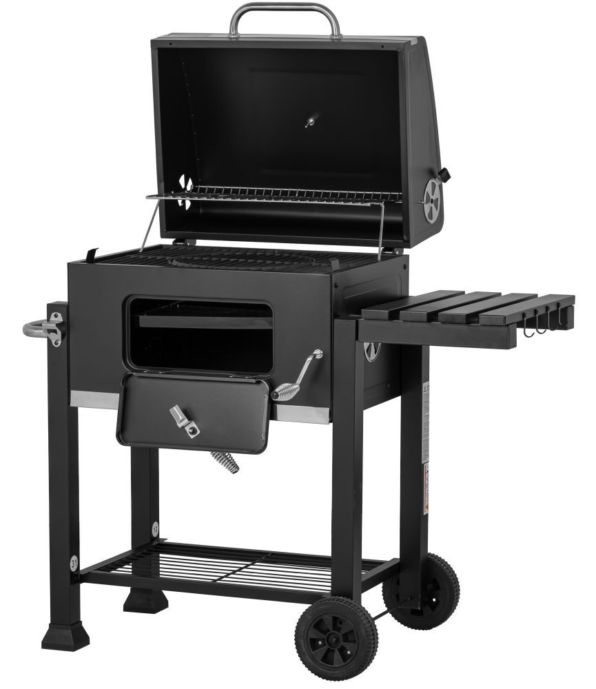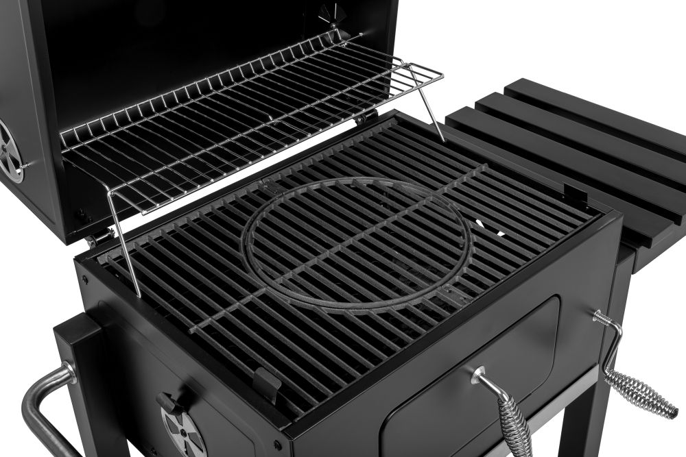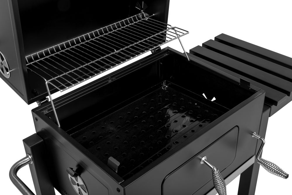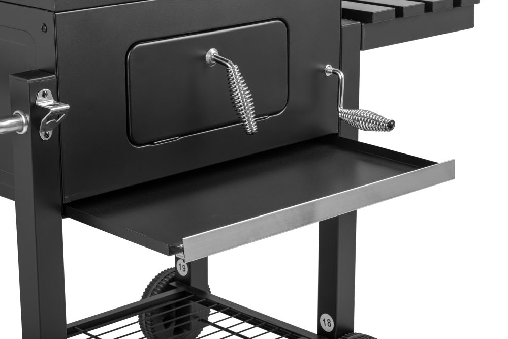 - wskaźnik temperatury w pokrywie; stabilna składana półka boczna z metalu z wieszakiem na akcesoria;