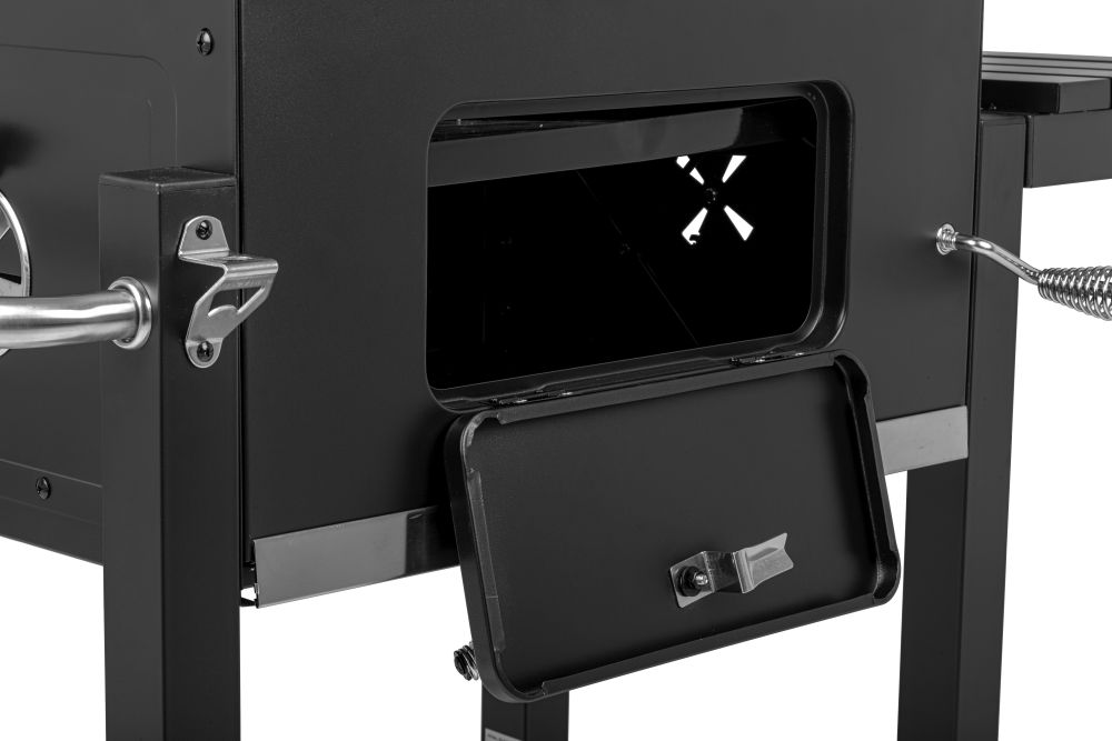 - sterowanie temperaturą grillowania za pomocą płynnej regulacji wysokości paleniska;