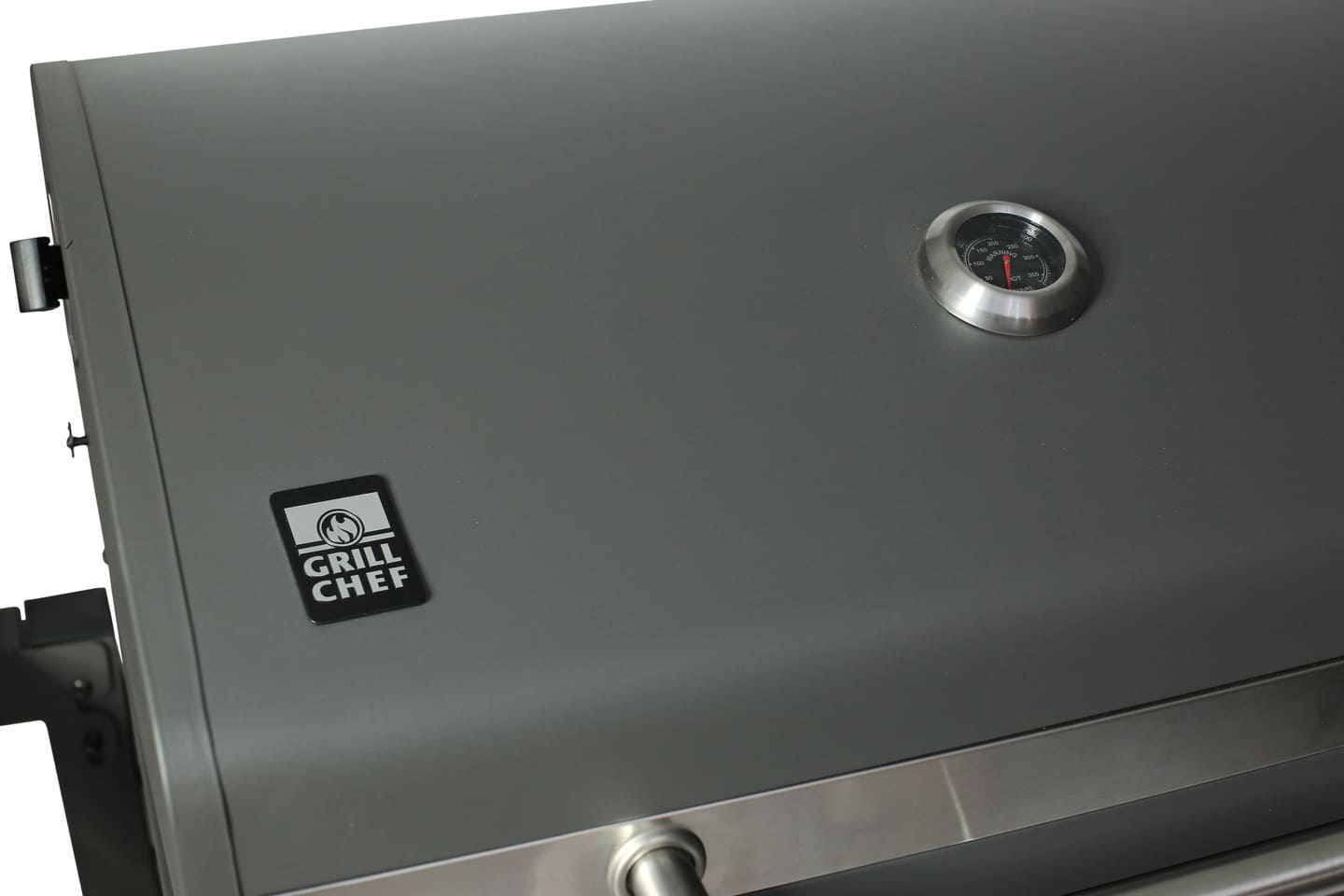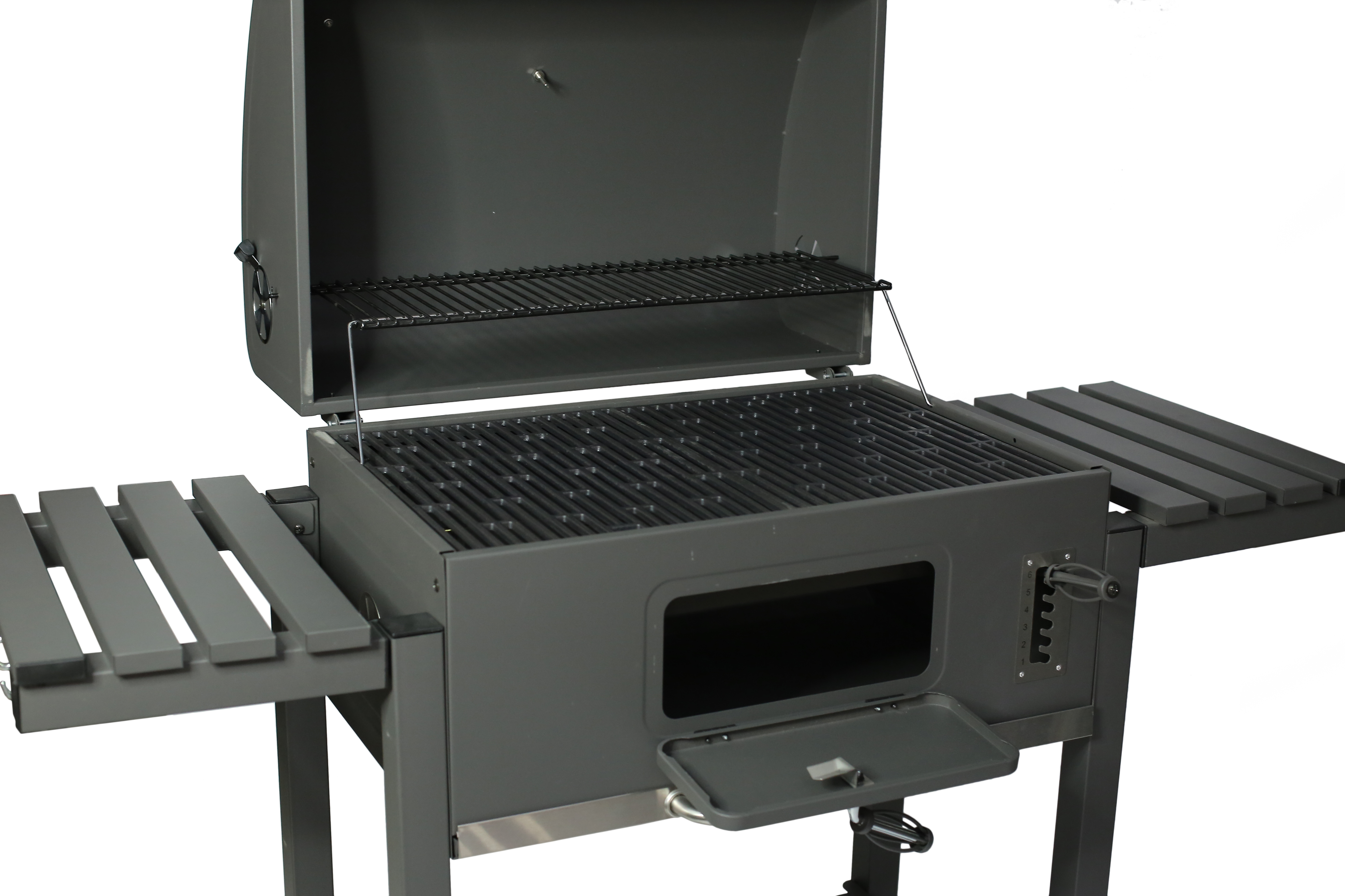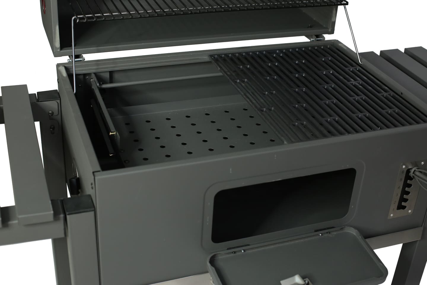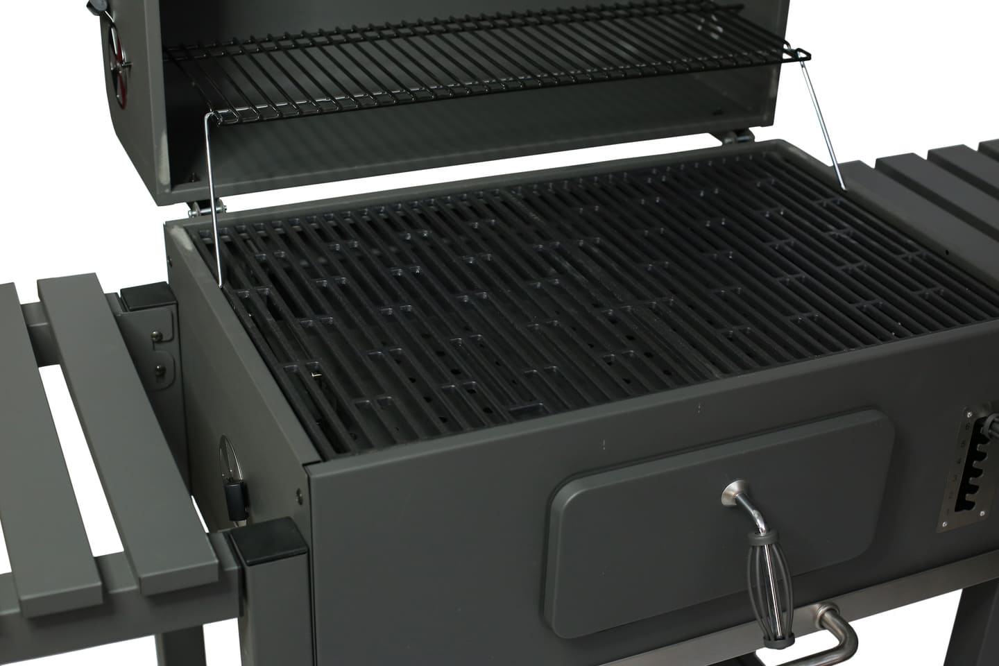 Dużym plusem, który cechuje ten grill węglowy, jest obecność dzielonego żeliwnego rusztu grillowego oraz ruchomego, emaliowanego rusztu do podgrzewania, który jest zawieszony w pokrywie o dużej powierzchni (71 cm x 48 cm). Oba ruszty możesz umyć w zmywarce, jednak po umyciu należy zakonserwować. Z kolei perforowaną blachę paleniskową możesz płynnie regulować za pomocą dźwigni. Grill wózek wyposażony jest też w wyciąganą szufladę na popiół, która pozwala zachować czystość nawet podczas goszczenia 14 osób.